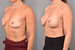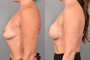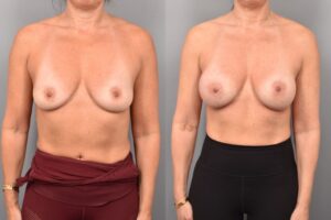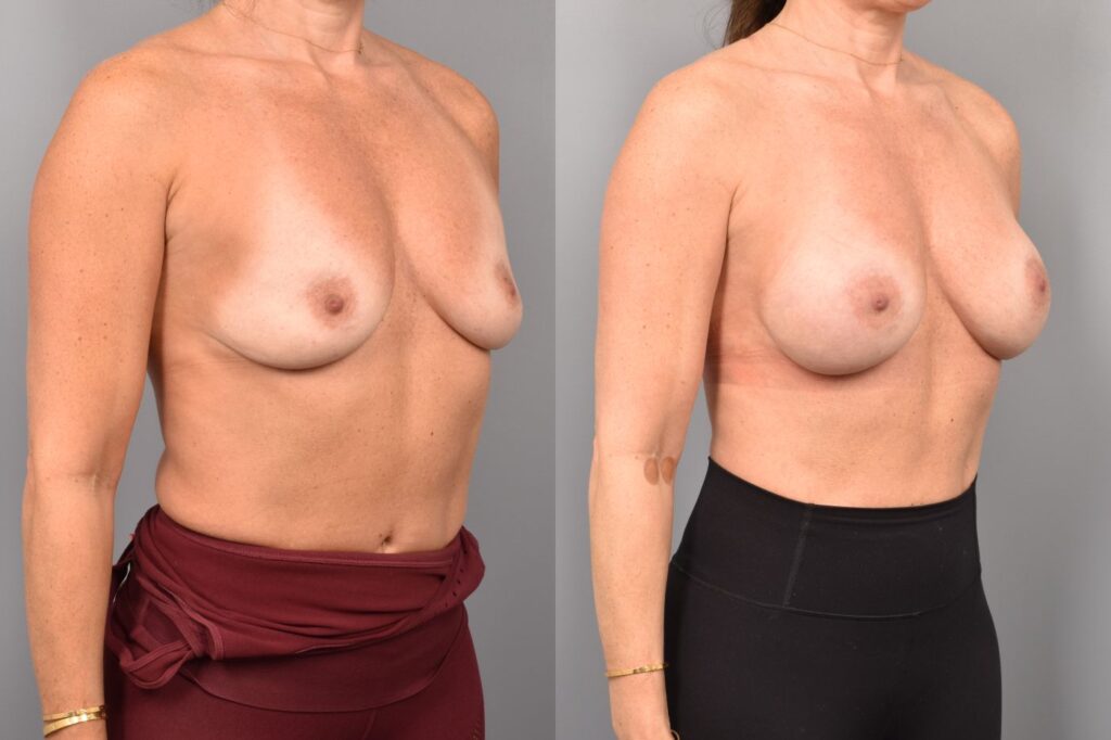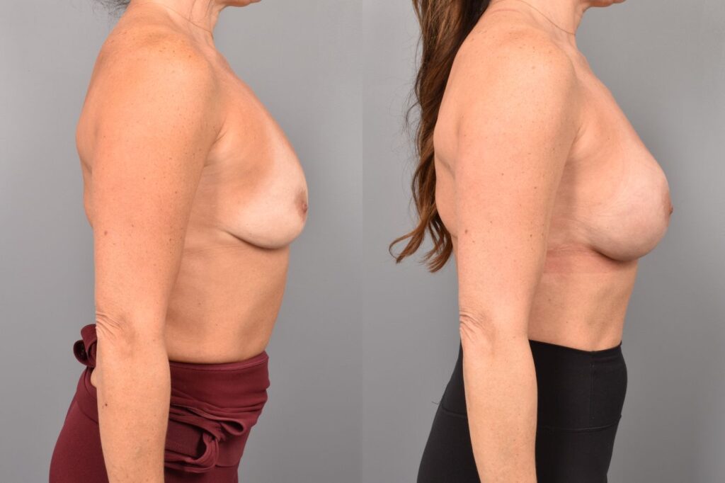 This lovely and very active 44 year old patient desired a perkier, more rounded and full appearance in her breast. She wanted a natural outcome and a more youthful appearance of her breast and chest. She is 5'3 and weighed 140lbs. Before surgery she wore a B cup bra with padding, and after surgery she is a full C without padding.