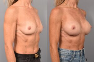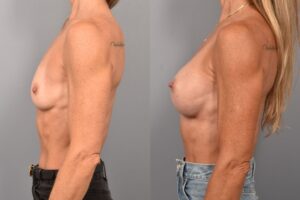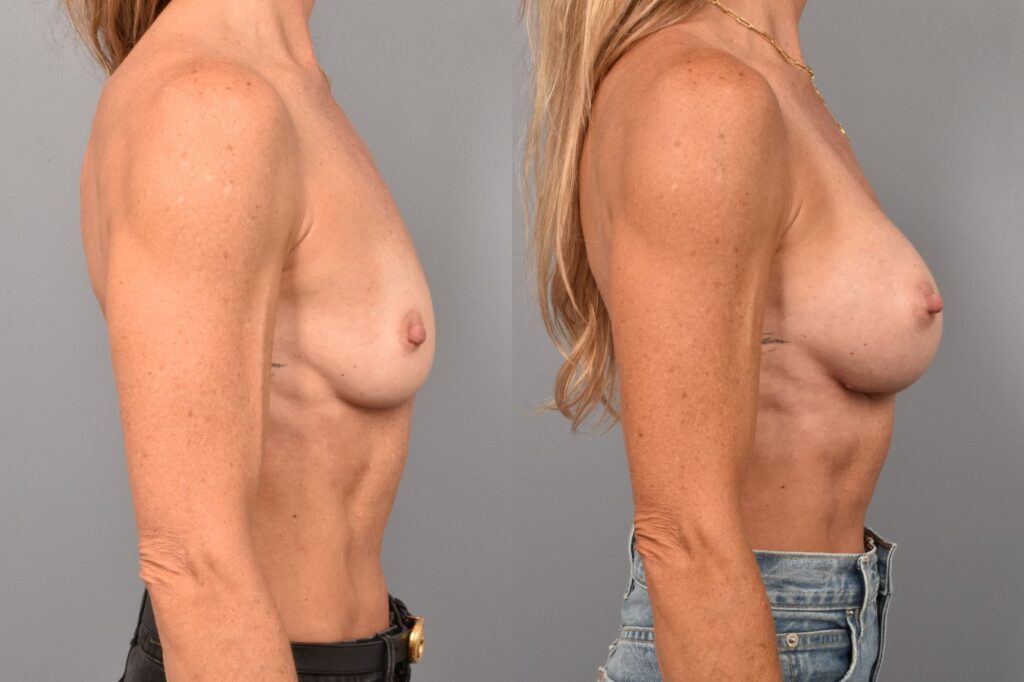 This athletic and lean 45 year old female presented for breast augmentation with silicone implants. Before surgery she was a size 34B and wanted to restore volume in her breast and upper chest while having the results look very natural at the same time. She is extremely fit, and she runs triathlons regularly. Because of this, we agreed to place the implants above the muscle (subfascial breast augmentation) to give her the look that she wants without interfering with her active lifestyle.